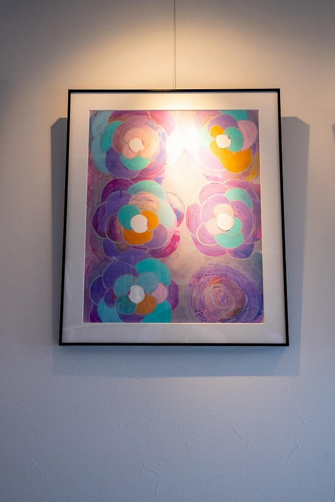 主にアクリル絵の具を使用し、画用紙やキャンバスに描かれた絵画作品です。画用紙の作品は額に入れて保存、展示いただくことをお勧めします。キャンバスの作品は重量も軽く出来ており、そのままで壁に飾っていただけます。展示風景の写真もございますので参考にしていただければ幸いです。